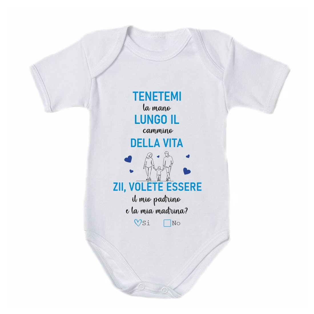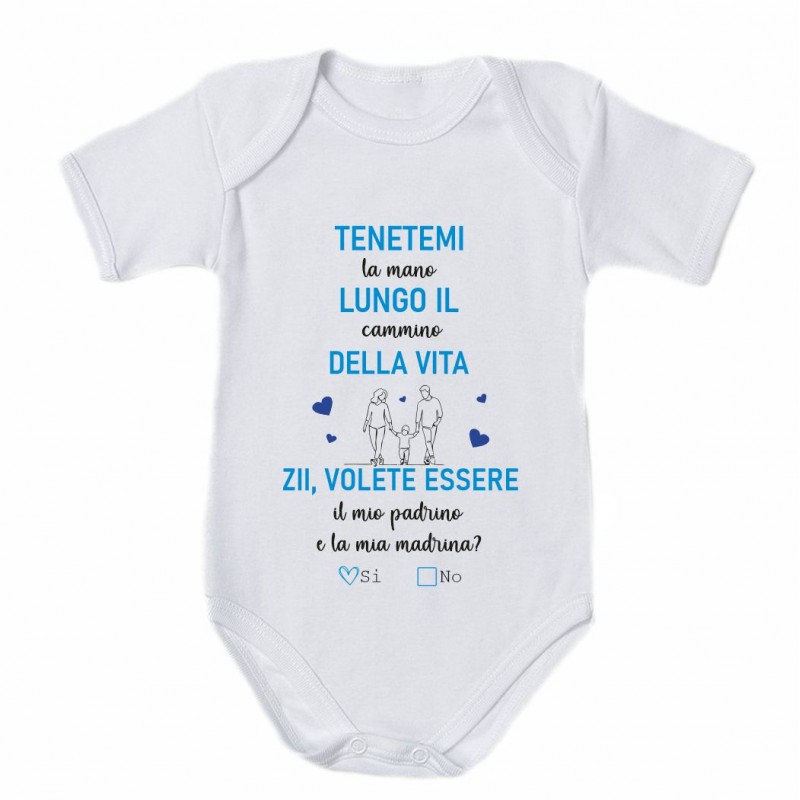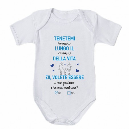 - Body neonato bimbo con stampa :"'Tenetemi per mano lungo il cammino della vita. Zii volete essere il mio padrino e la mia madrina?'.