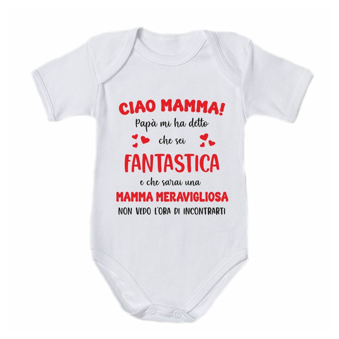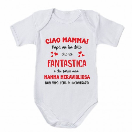 - Body neonato bimbo/a con stampa :" CIAO MAMMA , papà mi ha detto che sei FANTASTICA e che sarai una MAMMA MERAVIGLIOSA. NON VEDO L'ORA DI NCONTRARTI.